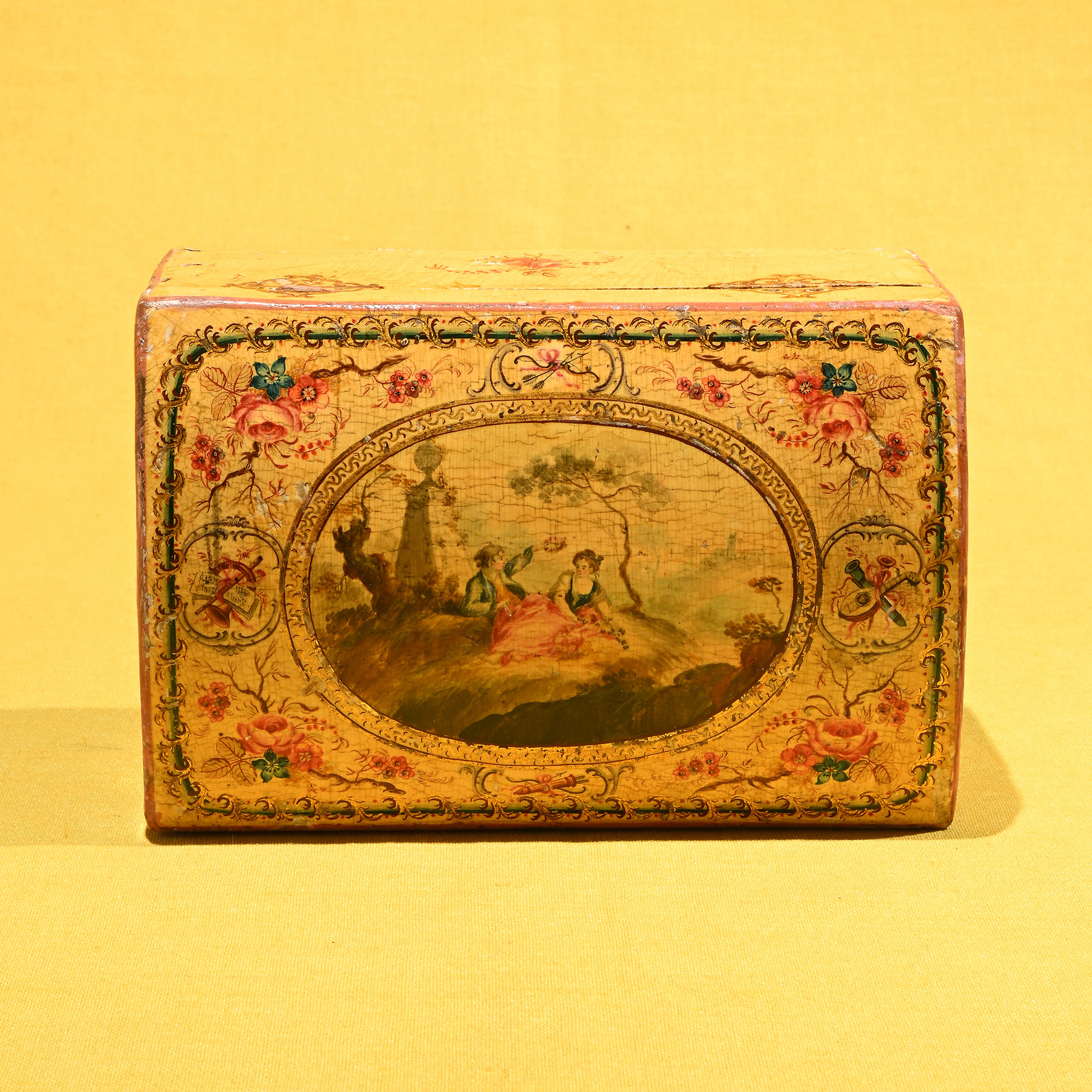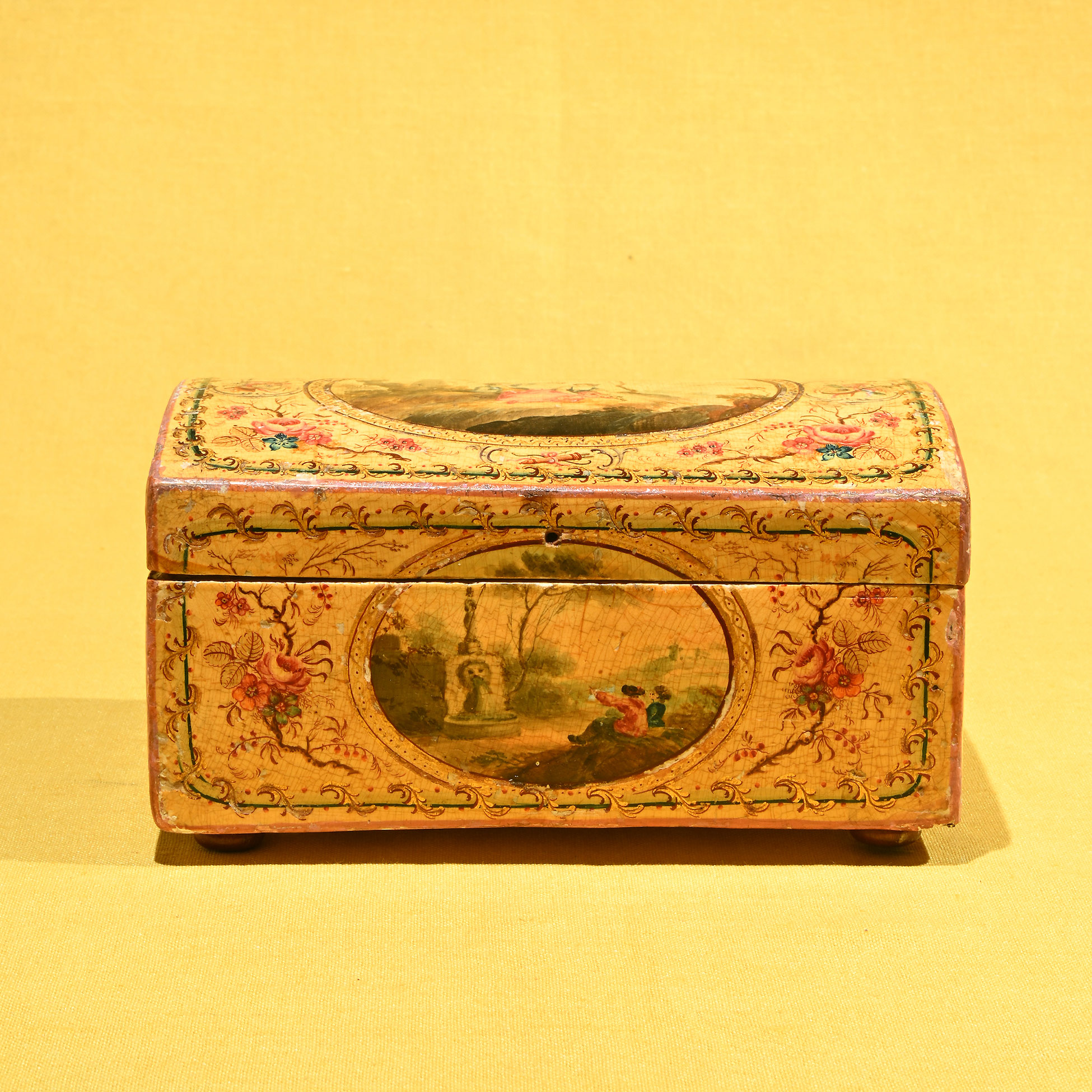 Cofanetto in legno laccato, Veneto XVIII secolo Decorato a motivi vegetali, floreali e di armi. In degli ovali sono raffigurate scene galanti. Dimensioni complessive 9x16,5x11 cm.