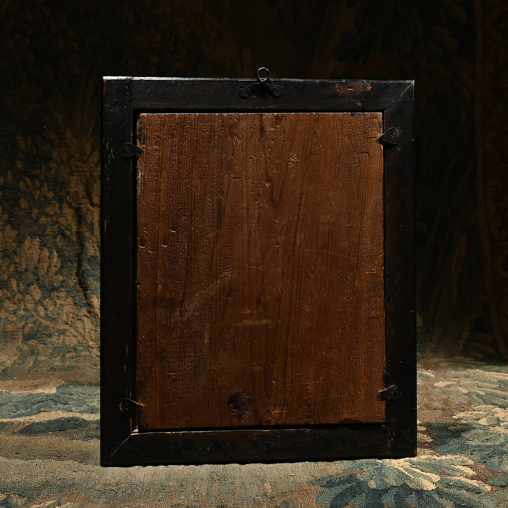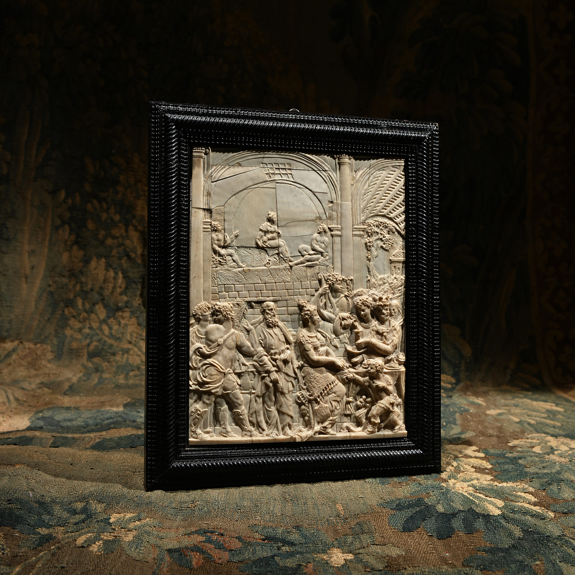 Placca raffigurante una scena galante di corteggiamento, Fiandre metà del XVII secolo Il presente lotto è accompagnato da documentazione CITES. Elegantemente lavorata a bassorilievo e stiacciato, è dotata di elegante cornice in legno ebanizzato. Dimensioni complessive 34x28x2,5 cm.
