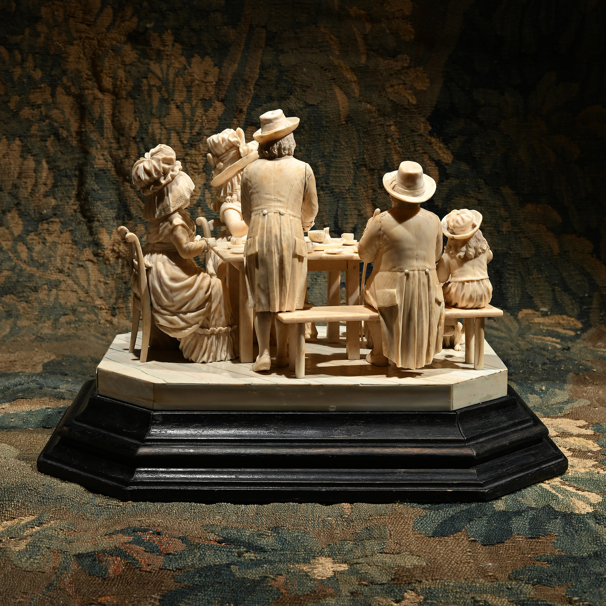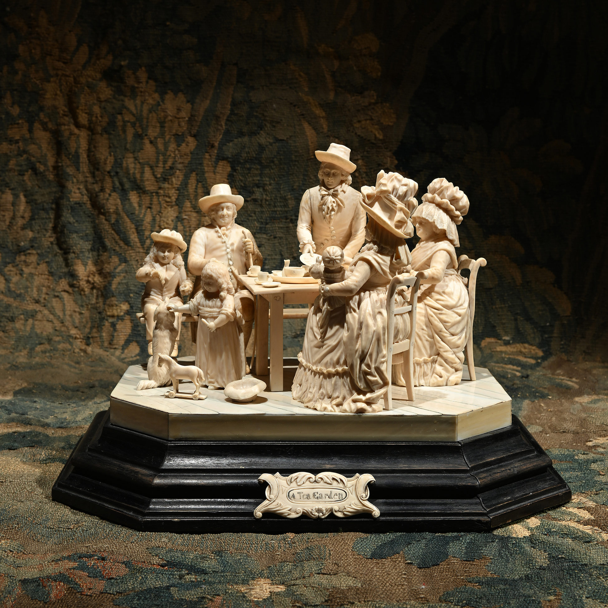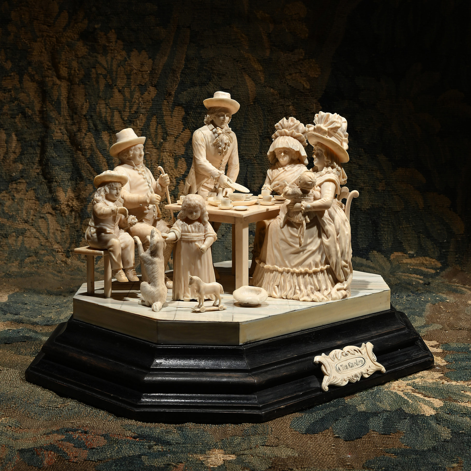 Gruppo scultoreo 'Tea Garden', Inghilterra ultimo quarto del XIX secolo Il presente lotto è accompagnato da documentazione CITES. Gruppo raffigurante una scena conviviale di una tipica famiglia inglese; dotato di basamento in legno ebanizzato. Dimensioni complessive 23x31x24 cm.