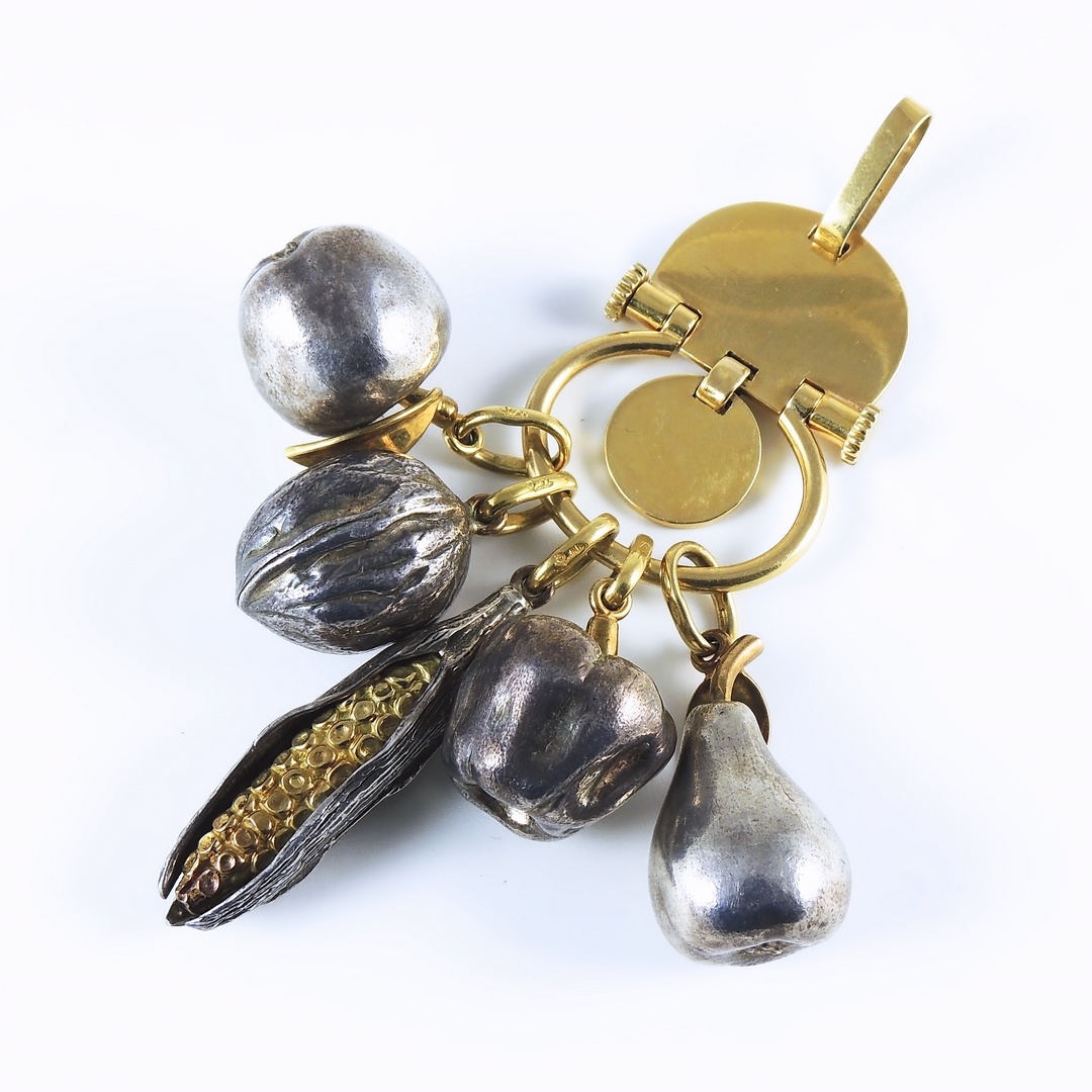 PORTACHIAVI IN ORO GIALLO E ARGENTO - GOLD AND SILVER KEYCHAIN Anni Sessanta - 60s con pendenti realizzati ad imitazione di frutti e ortaggi gr 76,7
