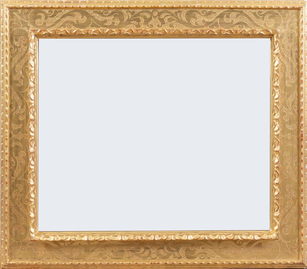 Cornice a cassetta in legno intagliato, dorato e bulinato. Federici, Bologna, anni '30-40 del XX secolo. Cm 66x76.