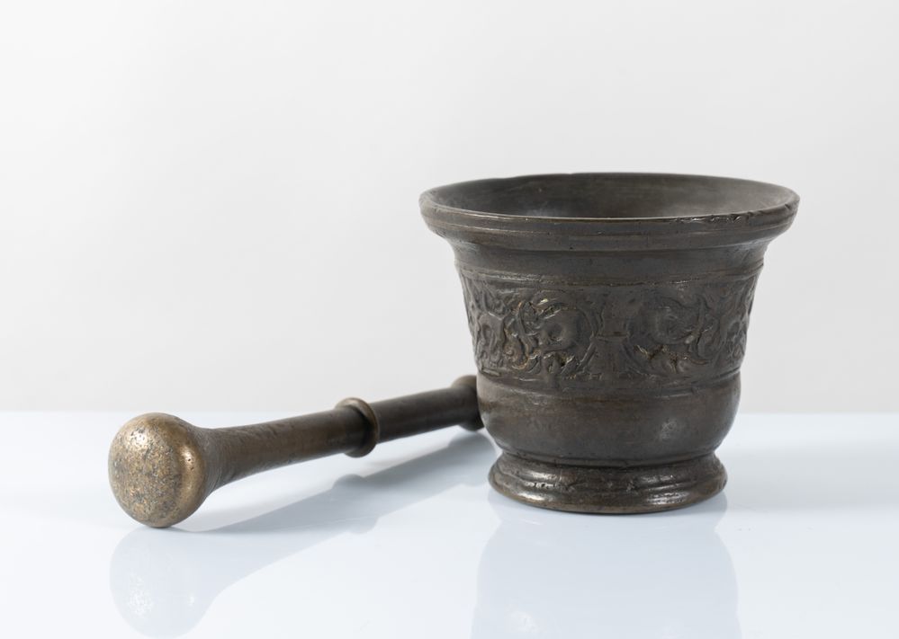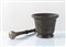 Mortaio in bronzo, copia di un mortaio rinascimentale eseguito nel XIX secolo. Reca pestello. Cm 11, diametro Cm 14; pestello Cm 23.5.