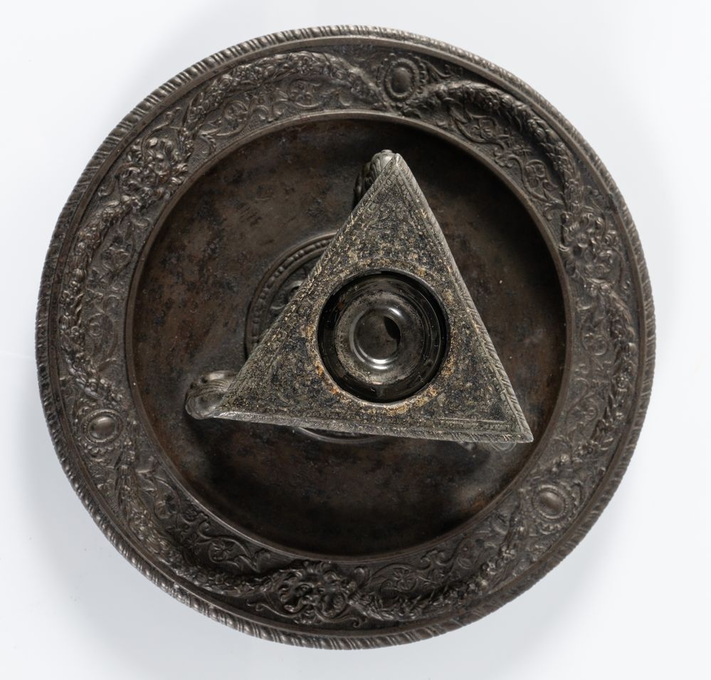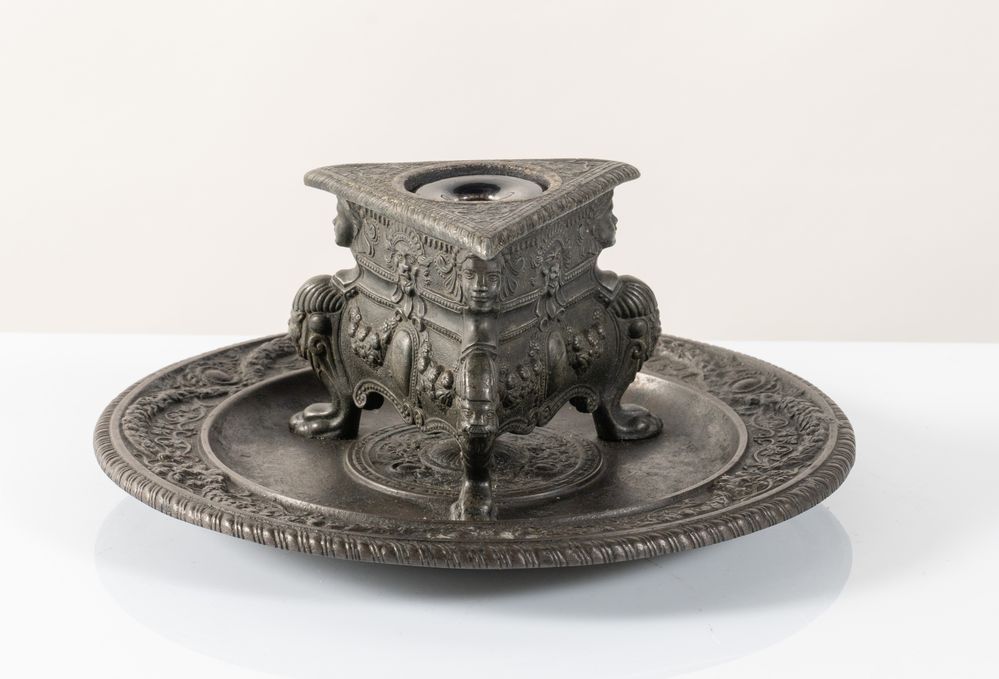 Calamaio in antimonio. Copia di modelli rinascimentali, realizzato agli inizi del XX secolo. Diametro: cm 21.5x9.