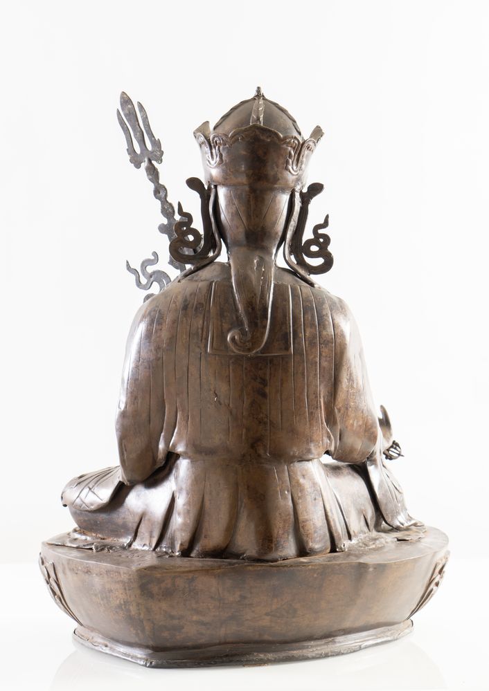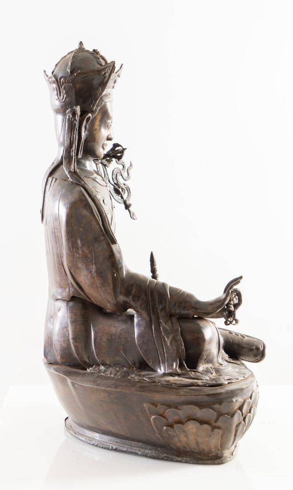 Scultura in bronzo, raffigurante Buddha seduto. Indonesia, XIX secolo. Cm 71,5x55x39.