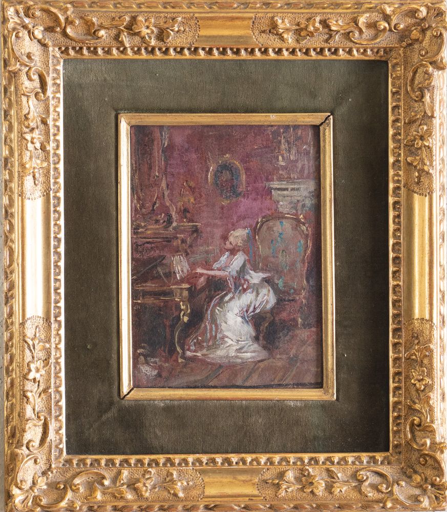 Pittore anonimo del XX secolo. "Dama al pianoforte". Olio su cartoncino. Cm 17x13.