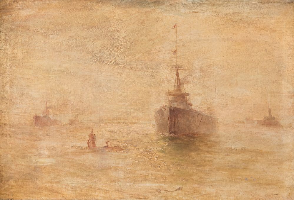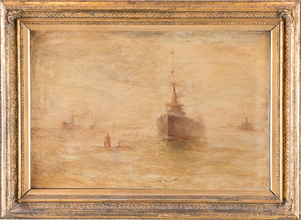 Pittore inglese della fine del XIX secolo - inizi del XX secolo. "Marina con navi da guerra e sottomarino". Olio su tela. Cm 40,5x61. Realizzato nel primo ventennio del XX secolo. Opera firmata in basso a destra. Al retro reca scritta in inglese non decifrata.