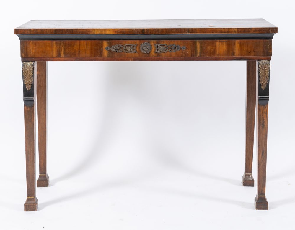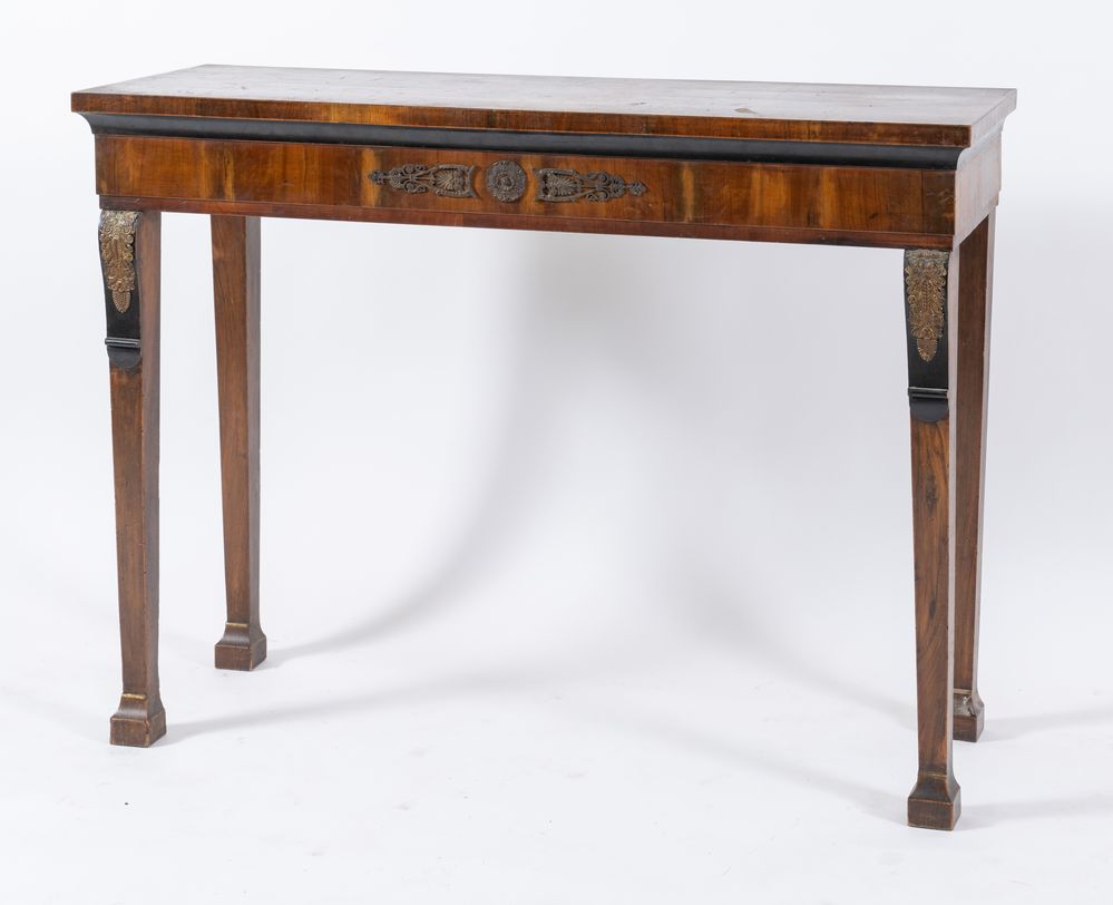 Consolle in legno di noce, con piano e fascia lastronati, sostegni ad erma con applicazioni in lamierino sbalzato e dorato. Bolonga, inizi del XIX secolo. Cm 94.4x125x42