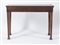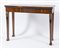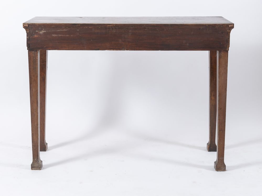 Consolle in legno di noce, con piano e fascia lastronati, sostegni ad erma...
