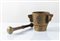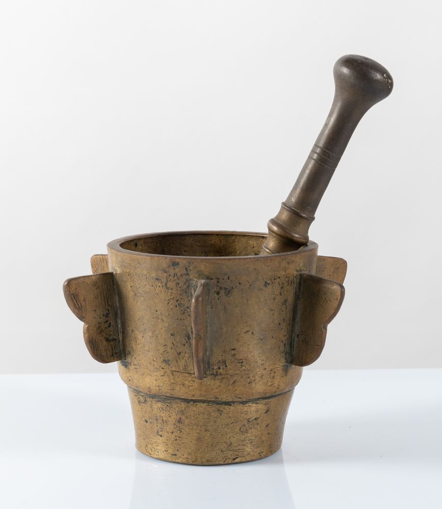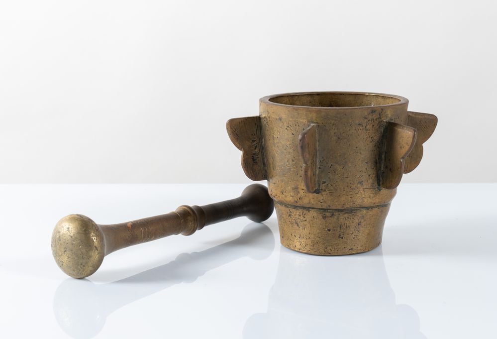 Mortaio in bronzo di gusto Decò. Anni '30 del XX secolo. Reca pestello. Cm 12, diametro Cm 12 (+5.5); pestello Cm 20.5.