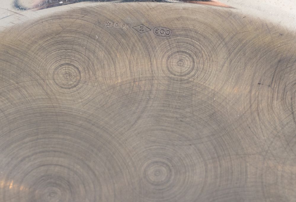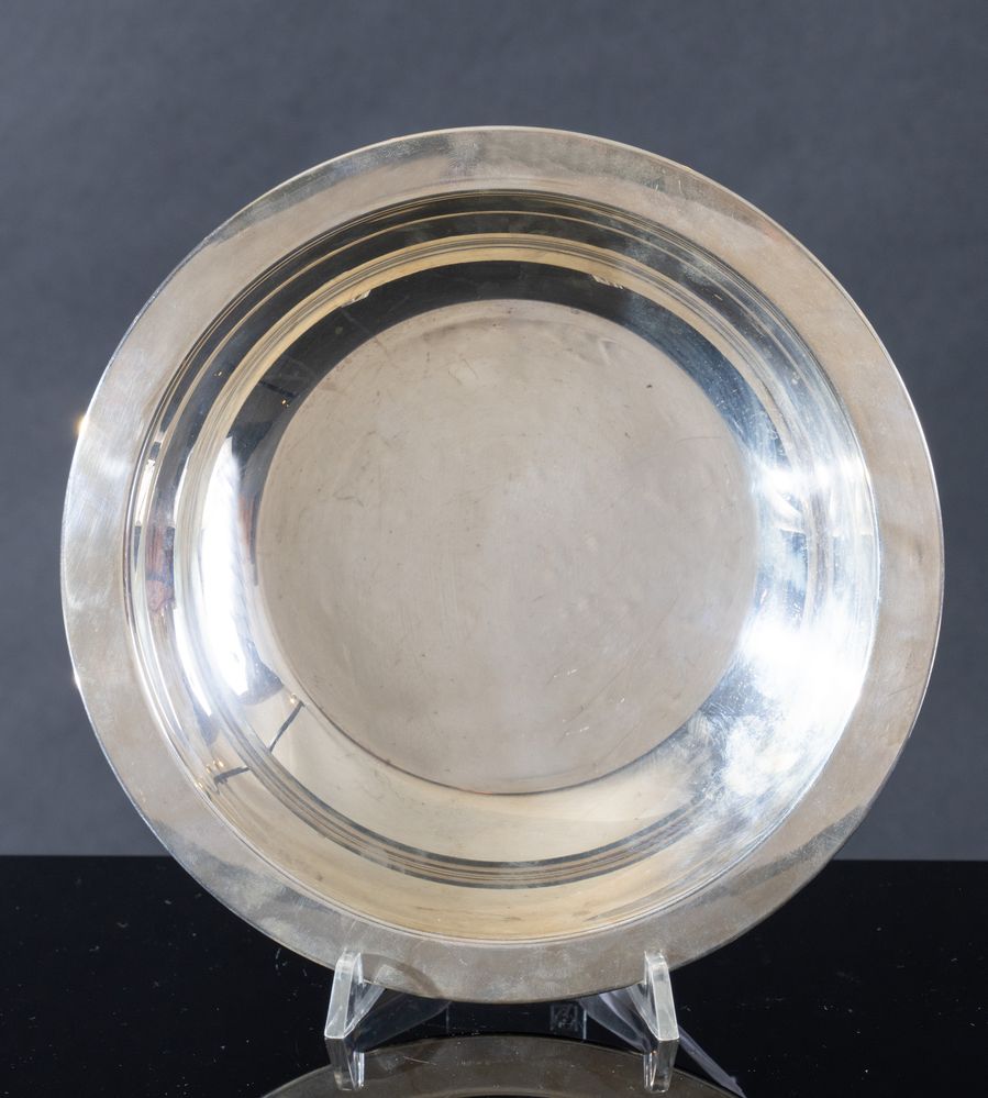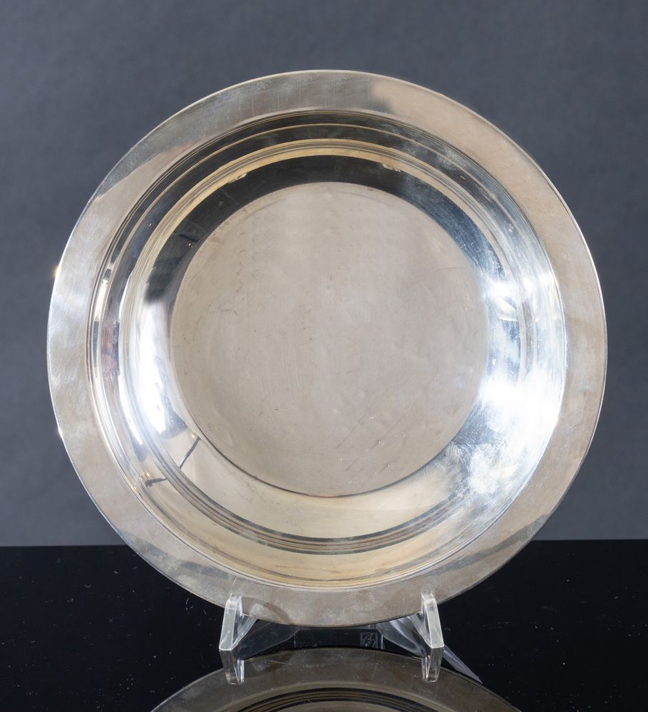 F.LLI ZARAMELLA BRUNO E CESARE, Padova, dal 1968. Piatto in argento 800. Cm 4; diametro cm 20,9. Sotto la base reca punzoni: 800, losanga locativa 30PD e stemma dell'argentiere. Peso: 201 gr.