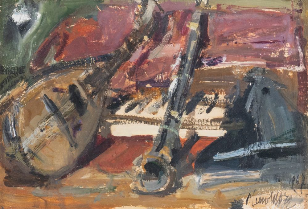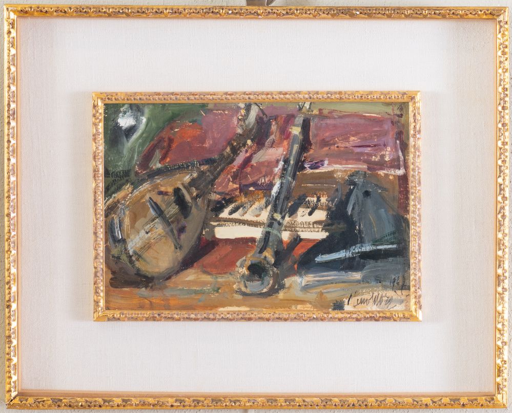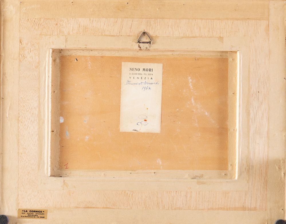NENO MORI (Venezia 1899 - 1968) "Strumenti musicali", 1967. Olio su tavola. Cm 20x29. Opera firmata e datata in basso a destra Nemo Mori 1967. Al retro reca etichetta dell'autore.