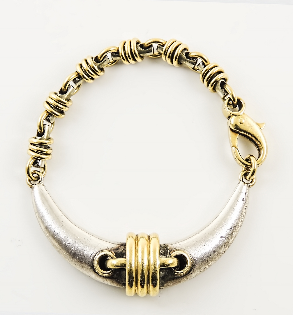 BRACCIALE IN ORO GIALLO E ARGENTO - GOLD AND SILVER BRACELET Pomellato, Anni Ottanta - Pomellato, 80s realizzato come due cornucopie stilizzate, cinturino a maglie bombate bicolore gr 56,7