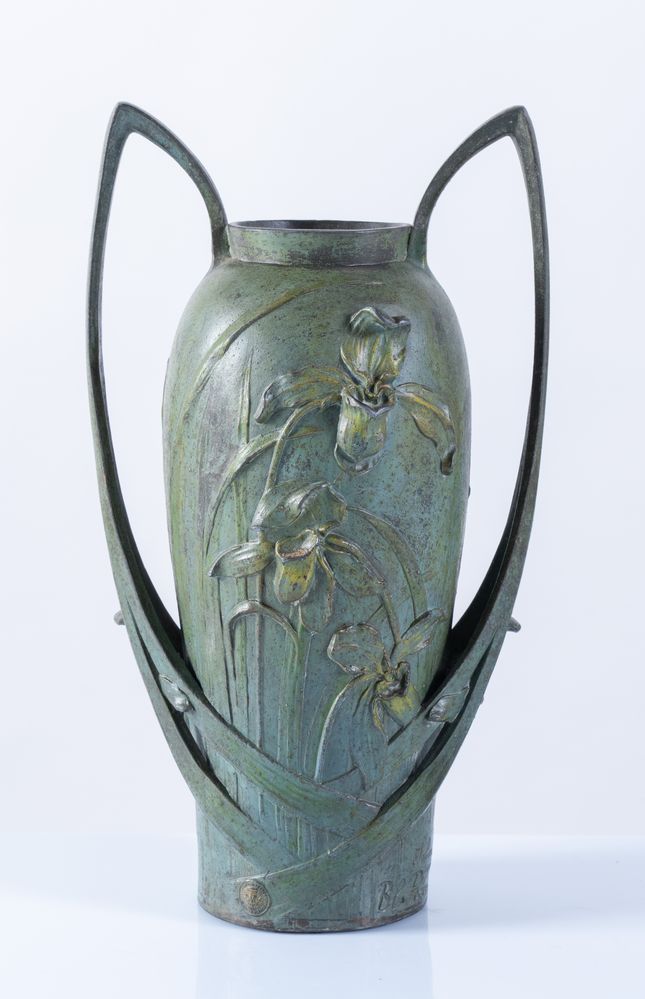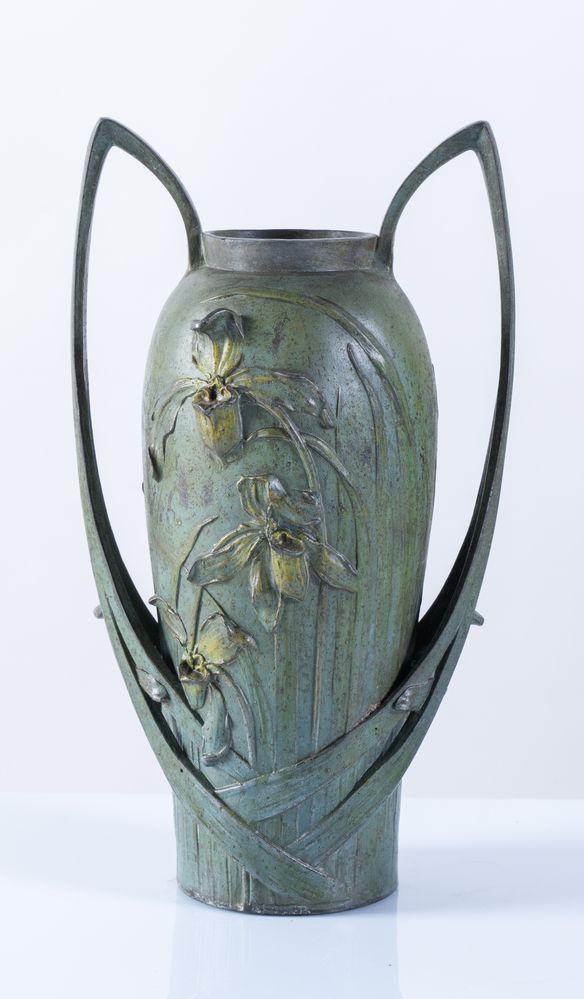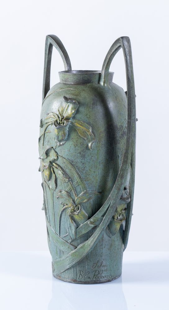 BLANCHE POCCARD DE SAINTILAU (Parigi, 1880-1972), Vaso in bronzo a due anse, con fusione a cera persa, patinato verde con iris gialli in rilievo. Cm 33x17. Opera firmata Bl. Poccard, Salon 1902.