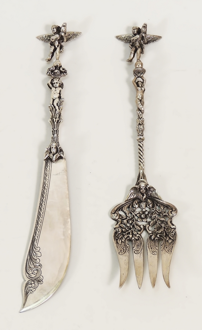 DUE POSATE DA PORTATA IN ARGENTO - TWO SILVER SERVING CUTLERY PIECES Peruzzi, Firenze riccamente sbalzate e cesellate con puttini e motivi vegetali e floreali, manici con finali modellati come il Putto con delfino del Verrocchio gr 255