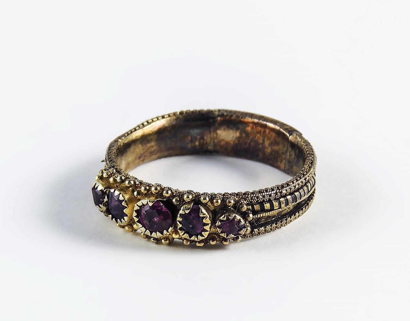 ANELLO IN ORO A BASSO TITOLO, RUBINI, CAPELLI - GOLD, RUBIES AND HAIR RING seconda metà del XIX secolo - late 19th Century centrato da tre rubini, difetti gr 3,8