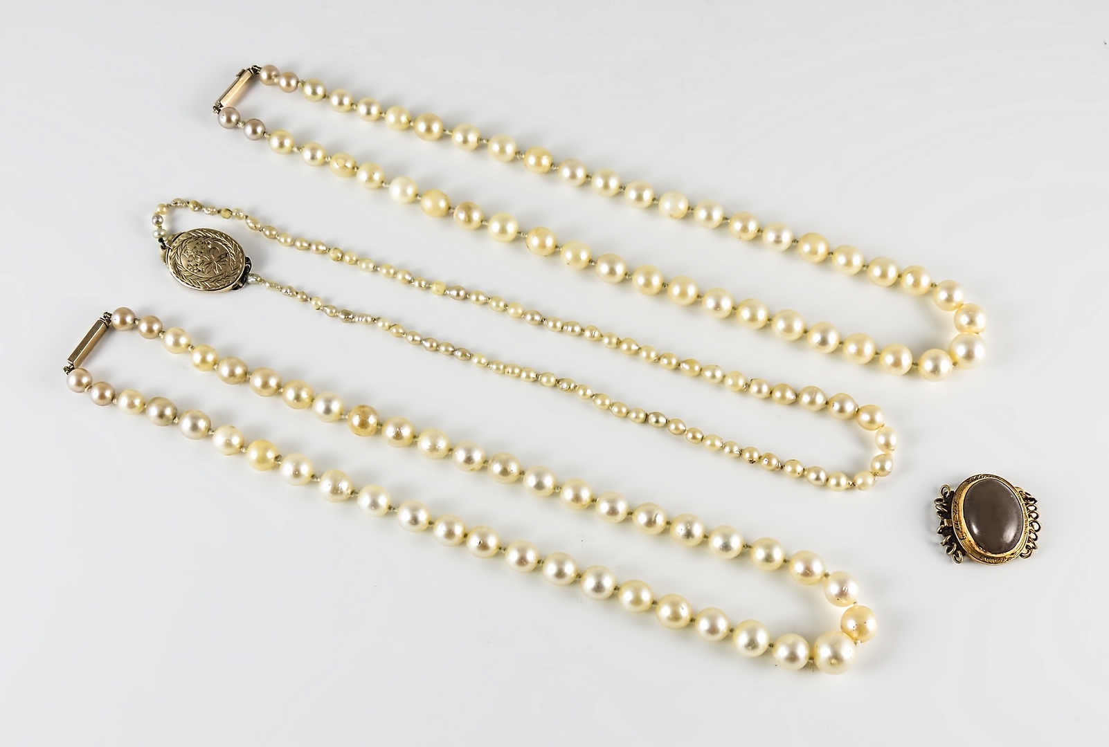 TRE COLLANE D'EPOCA IN PERLE - THREE OLD PEARL NECKLACES piccole fermezze in oro e una fermezza ovale in oro basso e pietra dura, difetti (4)