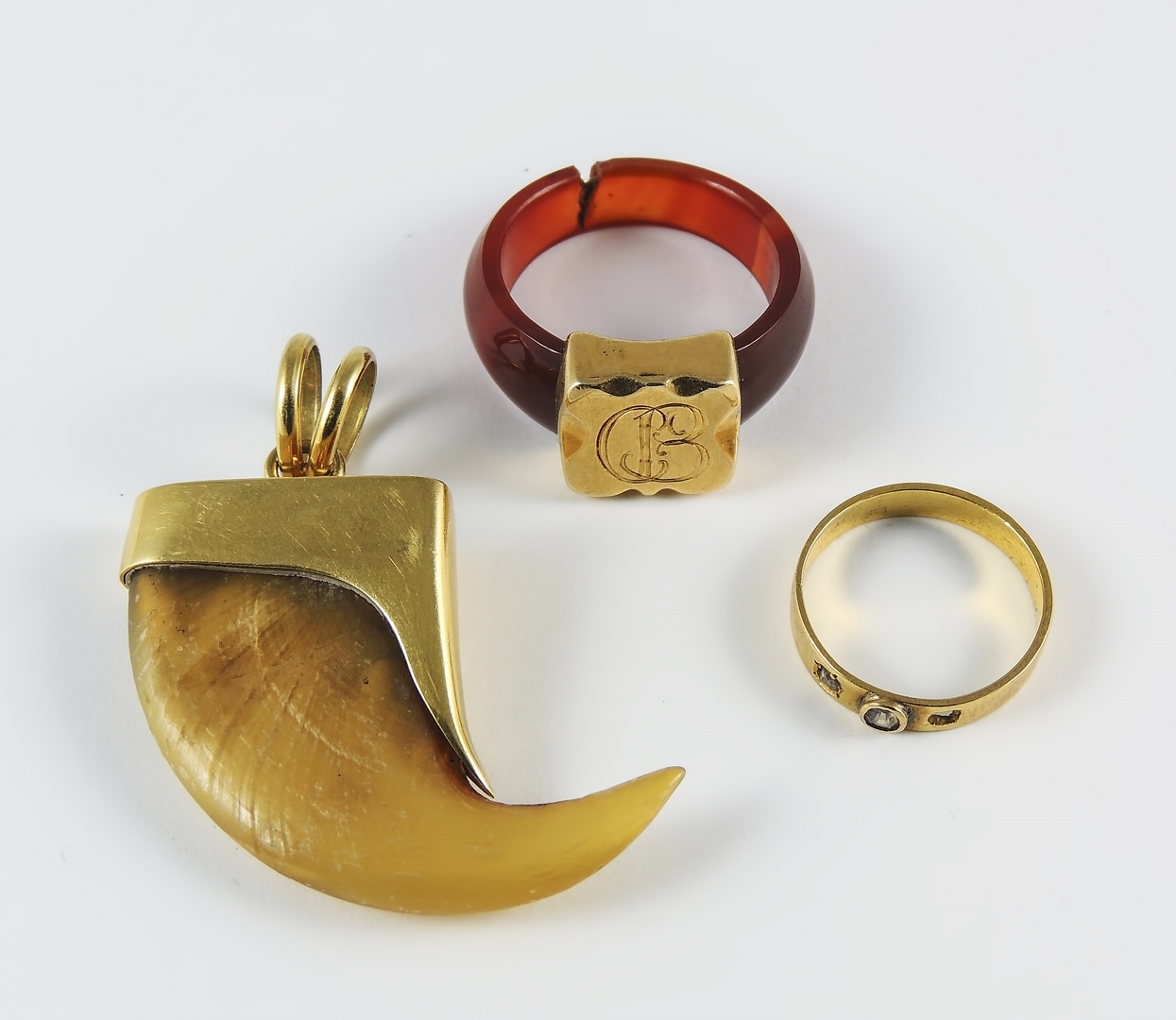 LOTTO DI GIOIELLI IN ORO - GOLD JEWELS LOT tra cui un ciondolo con artiglio di tigre ed un anello in corniola, difetti gr 18,4 lordi
