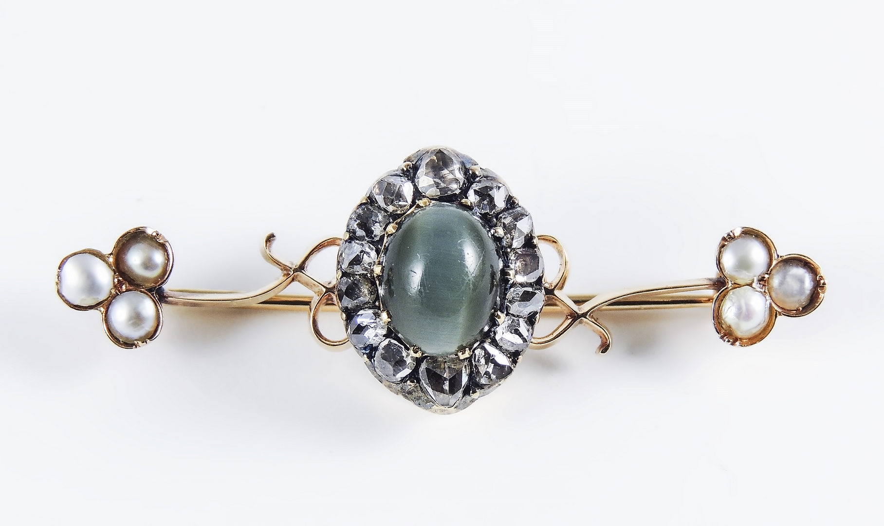 SPILLA A BARRETTA IN ORO A BASSO TITOLO, PIETRA DURA, ROSE DI DIAMANTI E MICROPERLE - GOLD, DIAMOND, HARD STONE AND PEARLS BROOCH inizio del XX secolo - early 20th Century al centro margherita impreziosita da rosette, volute laterali con microperle gr 6,0