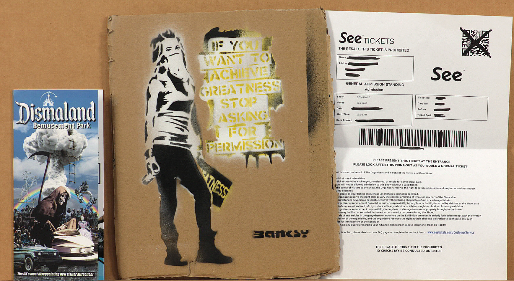 A corredo ticket d'ingresso a Dismaland e una brochure pieghevole di Dismaland