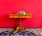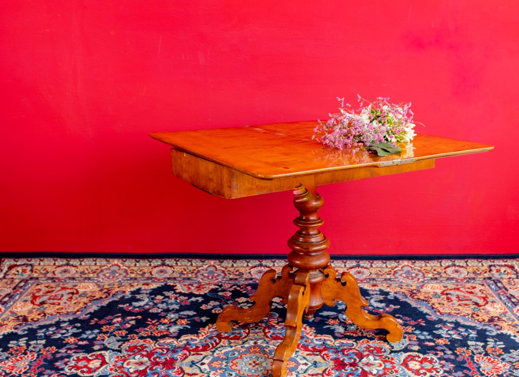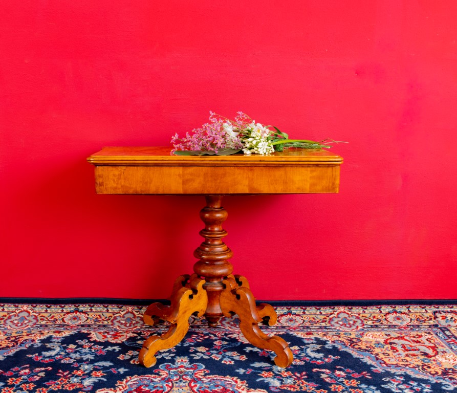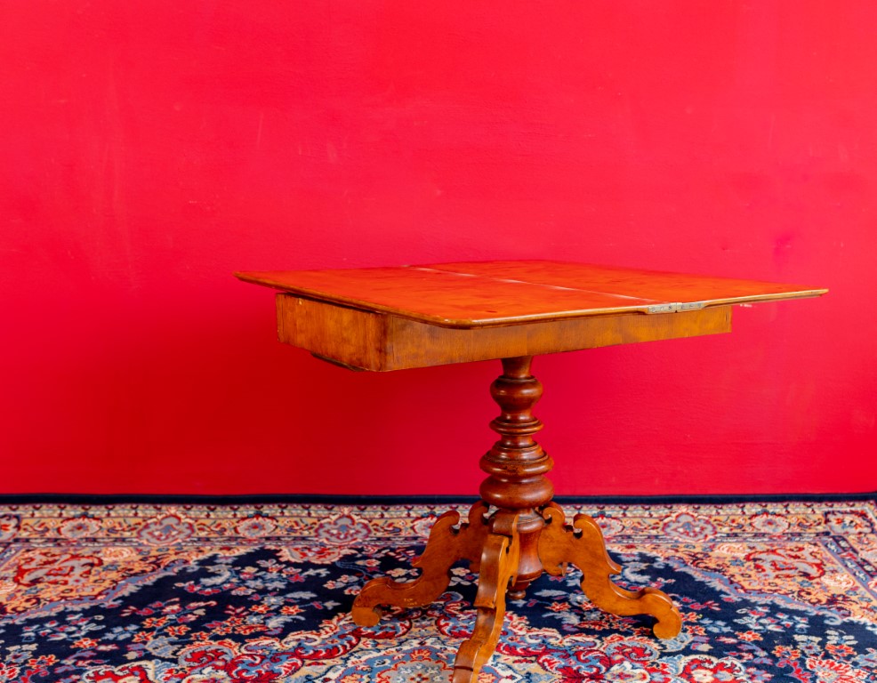realizzato con piano rettangolare da aprirsi a libro, fusto tornito su quattro gambe mosse