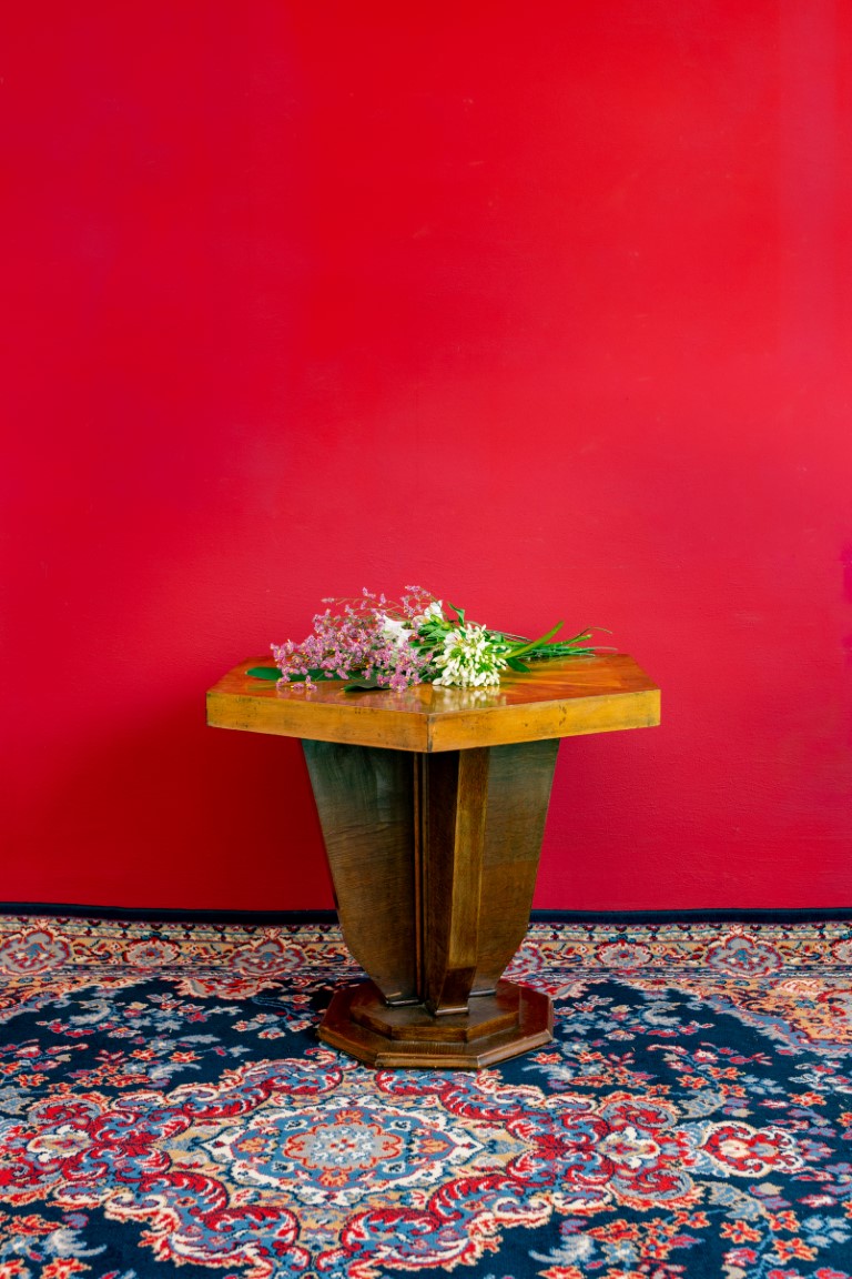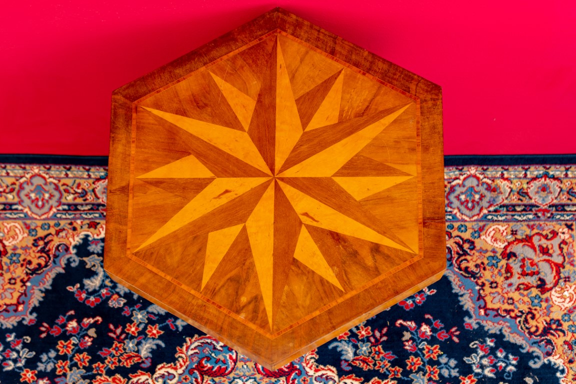realizzato con piano esagonale decorato con rosa dei venti intarsiata, sostegno a quattro elementi, base ottagonale