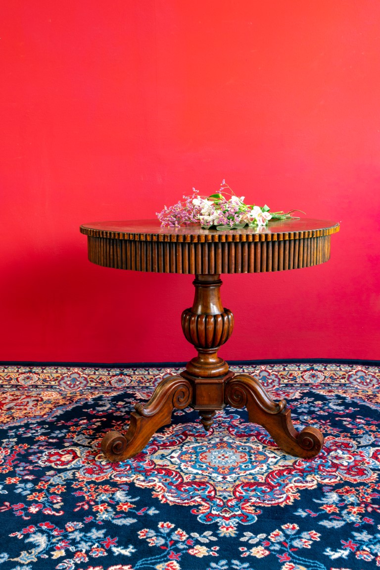 realizzato con bordo scannellato, sostegno a balaustro su tre zampe a voluta