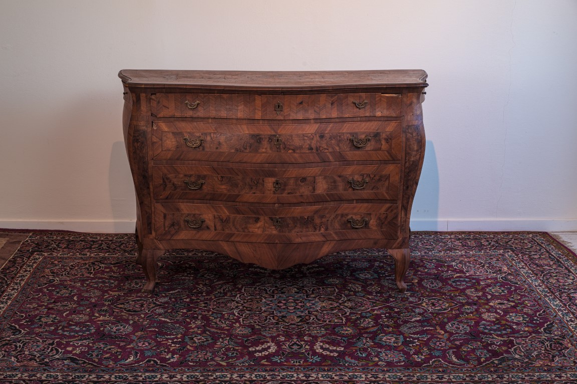 realizzato in stile settecentesco, piano sagomato con becco di civetta, fronte e fianchi bombati, un sottile cassetto frontale e due laterali sotto al piano, tre sottostanti, pendaglina sagomata frontale e laterale, gambe sinuose su piedi a ricciolo, costruito con materiale antico