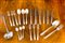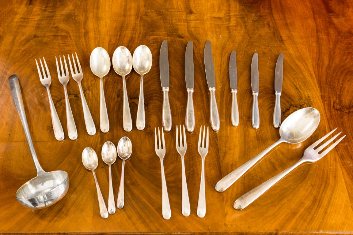 6 cucchiai, 6 forchette, 6 forchettine da dolce, un ramaiolo, una coppia di posate a servire