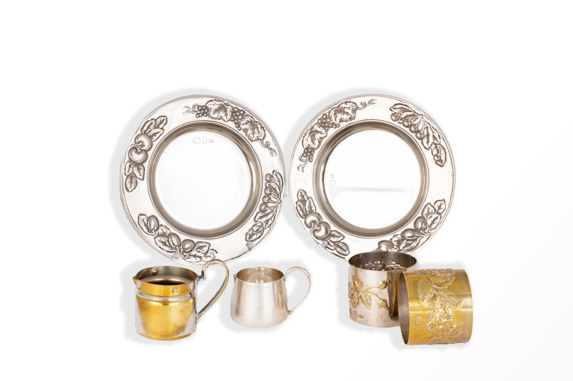 composto da due piattini con tesa sbalzata a frutta, due legatovaglioli in sbalzati a fiori, un bricchetto, il tutto in metallo argentato, Brandimarte Firenze ed un bricchetto da latte in argento, Brandimarte Firenze
