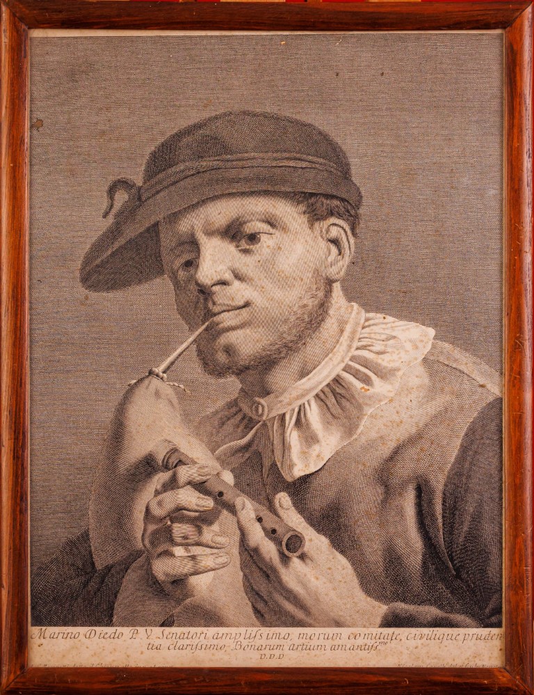 Acquaforte di Nicolo Cavalli (1730-1822) da un dipinti di Antonio Marinetti detto il Chiozzotto (1719-1796) con raffigurato un suonatore di zampogna