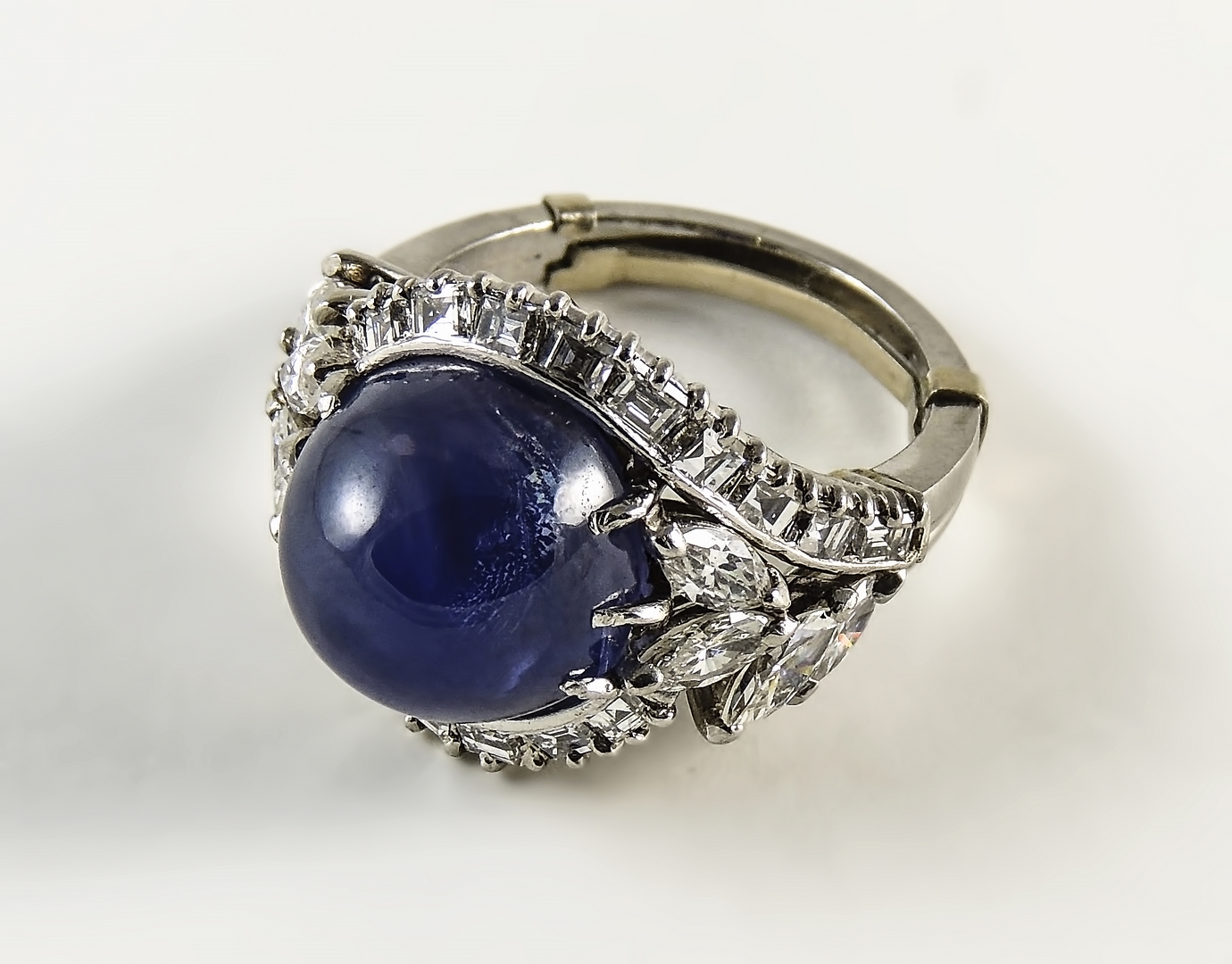 ANELLO IN ORO BIANCO E ZAFFIRO STELLATO - GOLD AND SAPPHIRE RING Anni Sessanta - 60s con al centro zaffiro cabochon impreziosito ai lati da diamanti taglio baguette e navette zaffiro ct 4 circa, diamanti ct 1,30 circa, gr 12,90