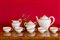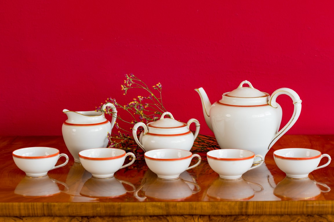 realizzato con rigo arancio, composto da 10 tazze, una teiera, una lattiera e una zuccheriera