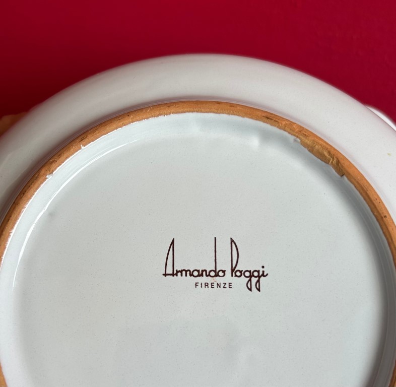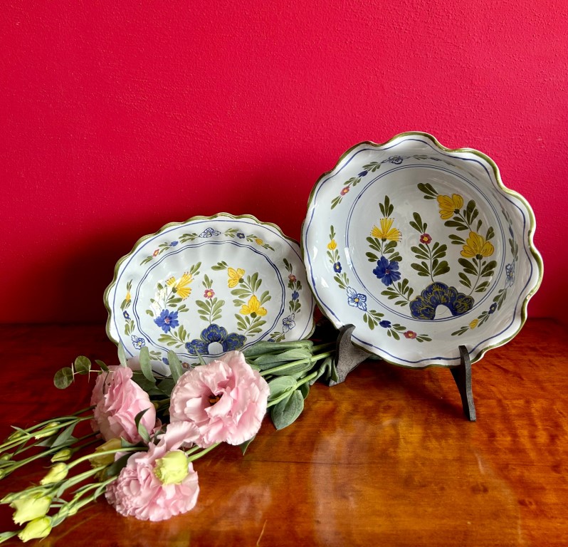 realizzate con bordo smerlato, dipinte a motivi floreali e vegetali nei toni del giallo, verde e blu