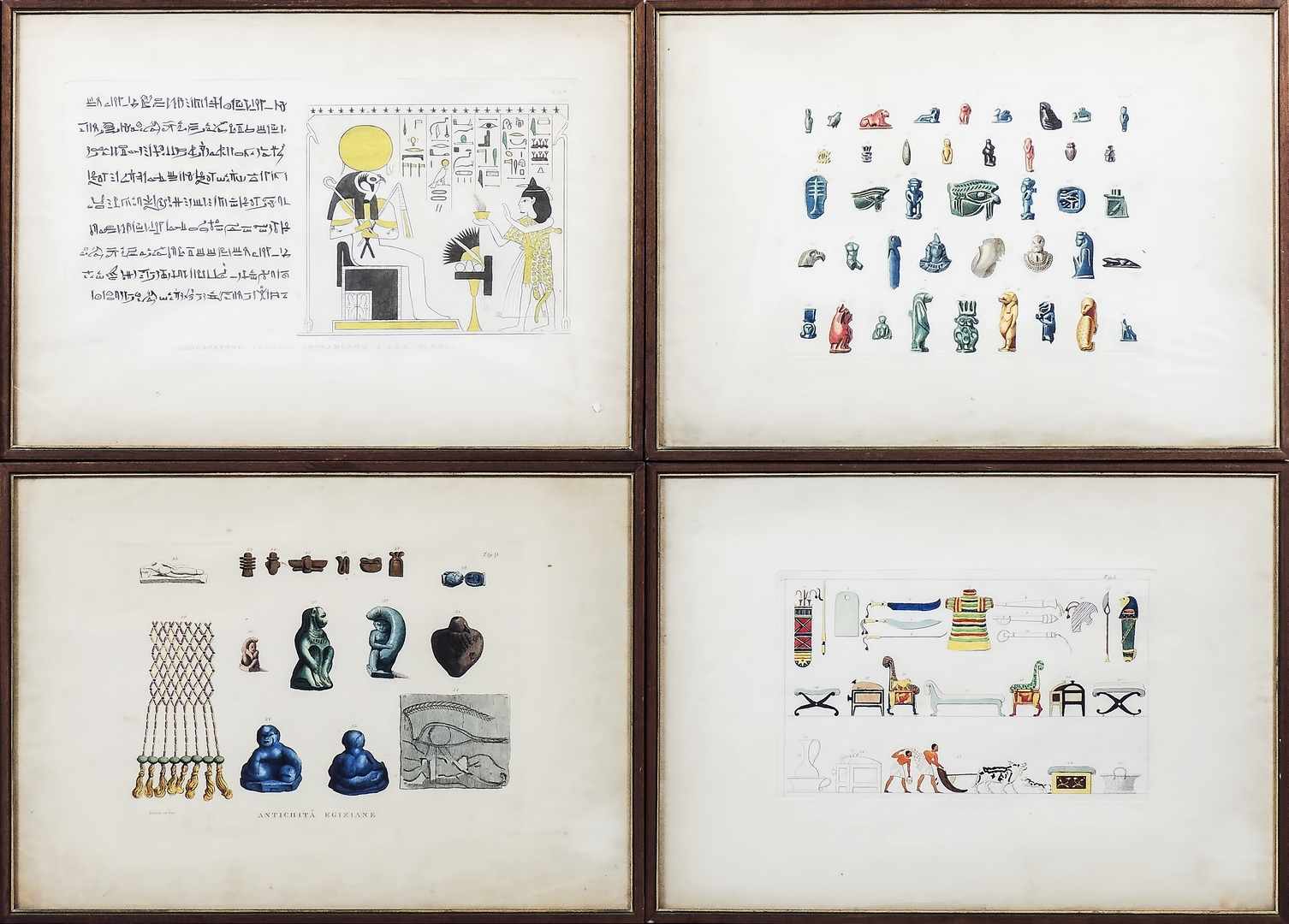 SERIE DI QUATTRO INCISIONI ACQUERELLATE - FOUR WATERCOLOURED ENGRAVINGS raffiguranti atichità egiziane tratte da disegni di Vivant Denon, in cornice cm 17x28