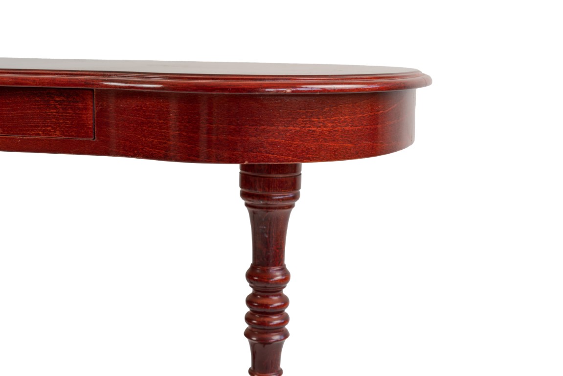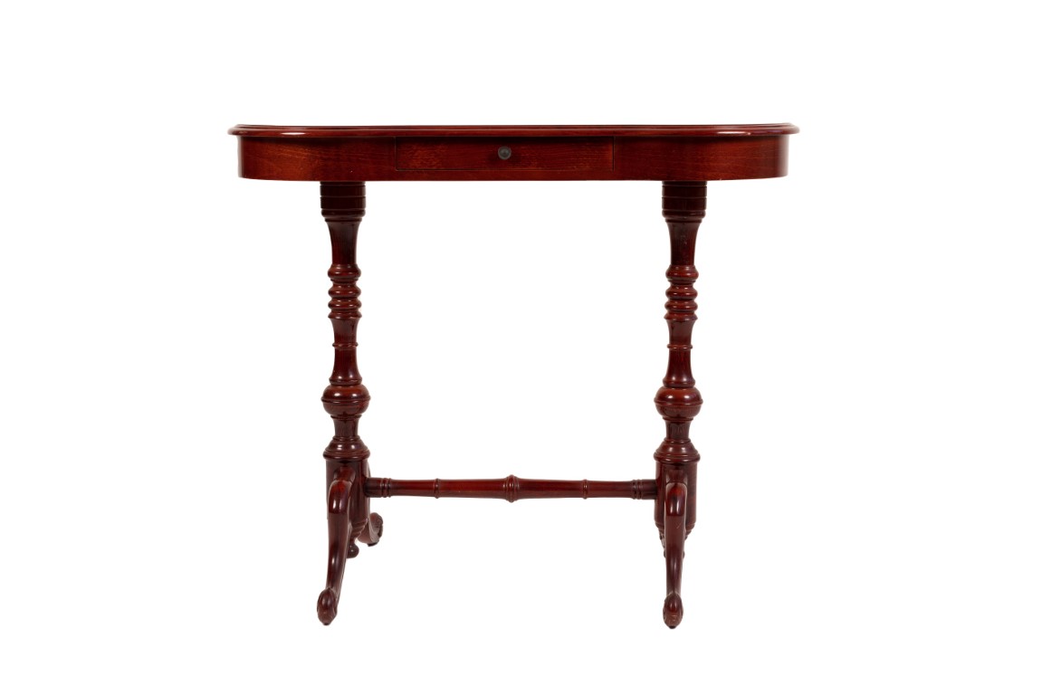 piano decorato con due figure di danzatrici, un cassetto nella fascia, sostegni torniti su gambe mosse riunite da traversa