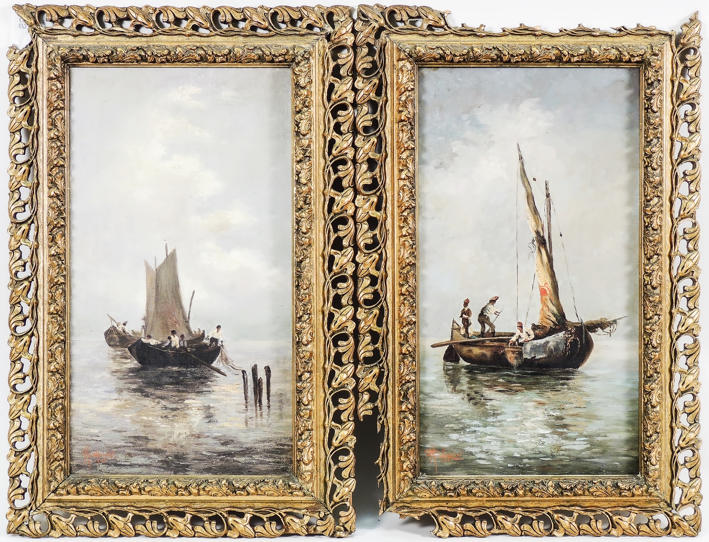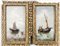 PAESAGGI MARINI CON BARCHE E PESCATORI - SEASCAPES WITH BOATS AND FISHERMEN inizio del XX secolo - Early 19th Century coppia di dipinti ad olio su tela - a pair of oils on canvas, firmati e datati R Schmidt 1906, in cornice cm 28x50