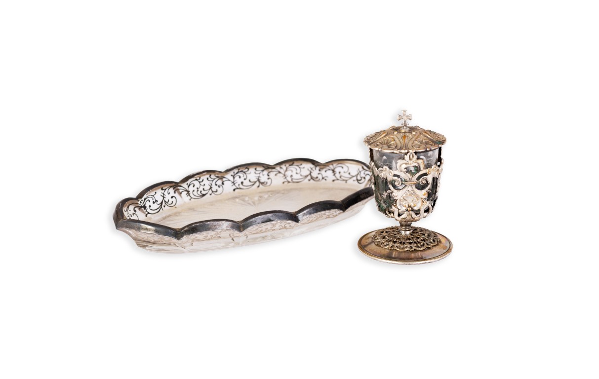 Lotto di curiosità in vetro e metallo argentato e cesellato