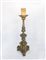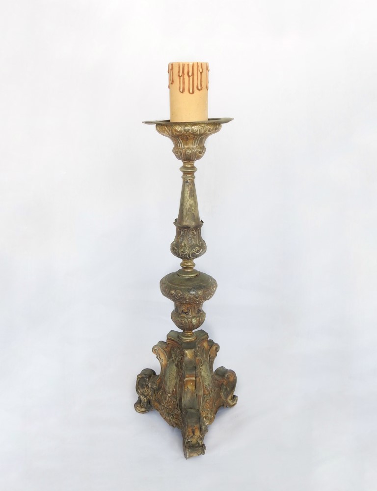 in metallo argentato, fusto a balaustro su base tripode con piedi a ricciolo
