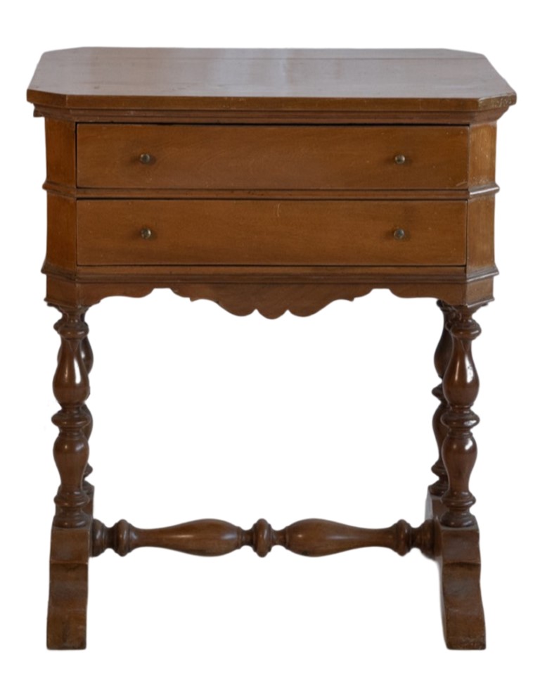 piano rettangolare con angoli scantonati, due cassettini sottostanti, pendaglina sagomata frontale e laterale, piannacoli torniti angolari, gambe tornite riunite da traversa su piedi a ciabatta