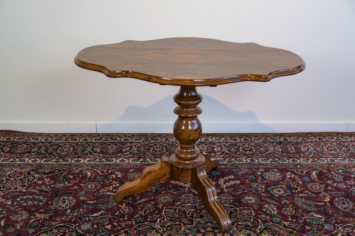 piano sagomato a vela, fusto tornito a balaustro su tre gambe mosse