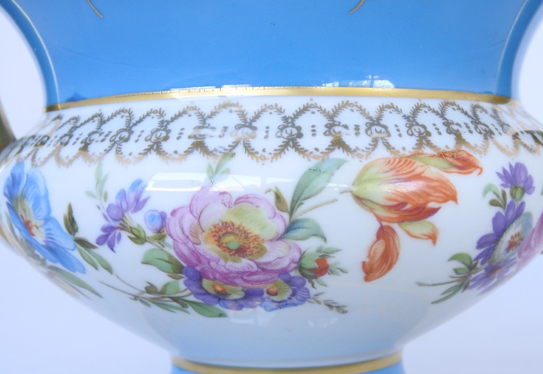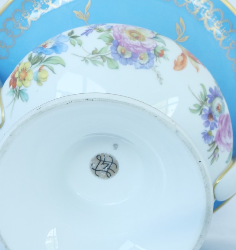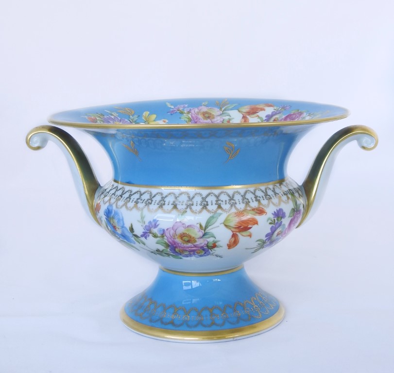 Realizzata in porcella bianca e azzurra e profili dorati, con decorazioni variopinte a fiori