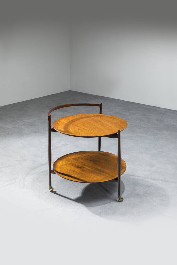 Carrello da bar in legno a due livelli con piani rimovibili e particolari in ottone.