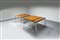 Coppia di tavoli con struttura in acciaio e piano in legno.