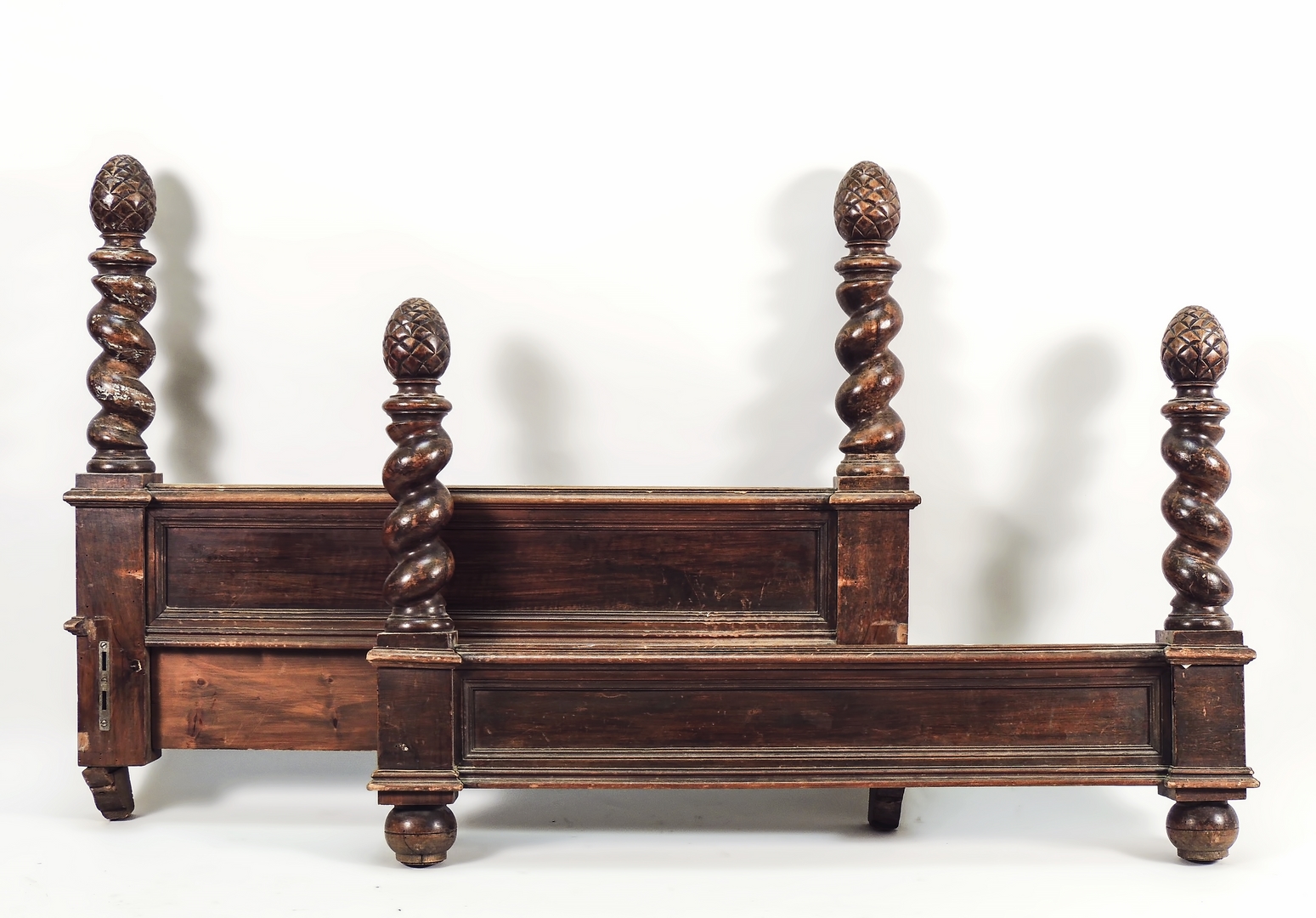 LETTO SINGOLO IN NOCE - WALNUT SINGLE BED piccole colonne a torciglione e finali a pigna, completo di traverse