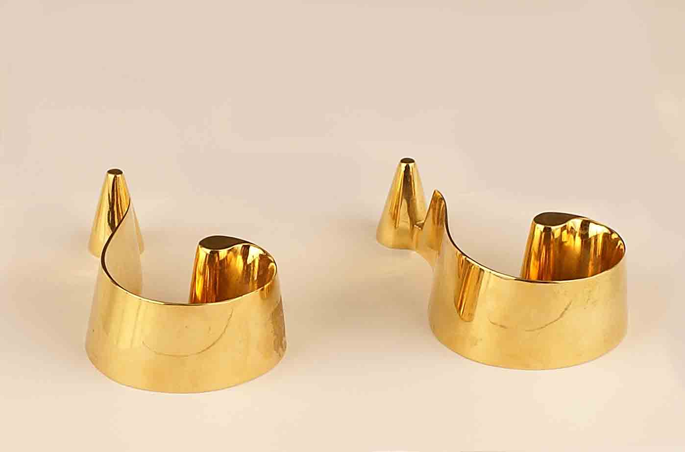 Coppia di press papier in metallo dorato a foggia di punto interrogativo, cm. 14x7.