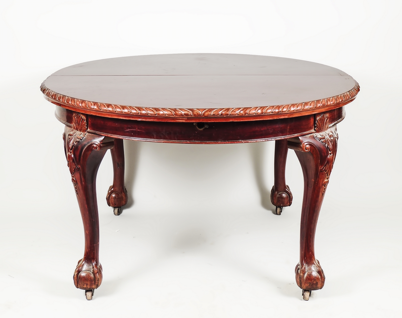 TAVOLO OVALE IN MOGANO - MAHOGANY OVAL TABLE Inghilterra, metà del XX secolo - England, mid 20th Century bordo intagliato a corda, gambe mosse con attacco a foglia di acanto, piedini a artiglio su palla con rotelle, corredato di tre prolunghe h cm 74x120x128, le prolunghe ciascuna cm 122x54