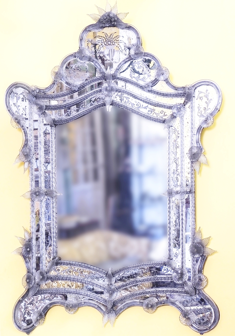 GRANDE SPECCHIERA IN VETRO SOFFIATO - VENETIAN GLASS MIRROR Murano, Fine del XIX/inizio del XX secolo - Murano, early 20th Century forma sagomata, alta cimasa tripartita, incisa con motivi vegetali ed arricchita da applicazioni di rosoni e fiori, lievi difetti, alcuni fregi di ricambio cm 140x100