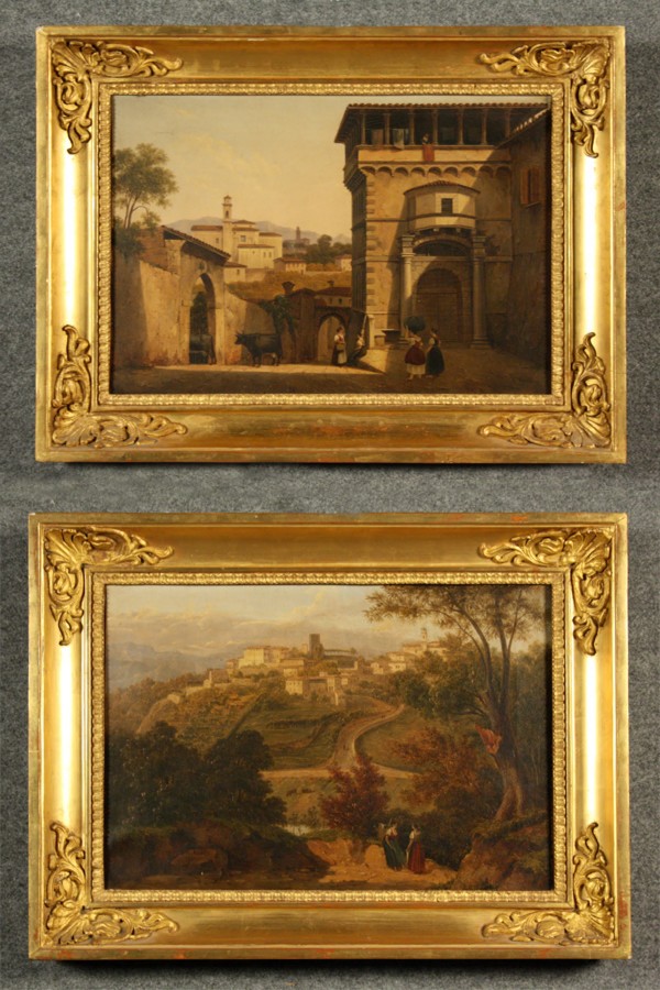 Firmato, datato. RAULIN ALEXANDRE - Francia, XIX secolo. Coppia di dipinti olio su tela raff. ''PAESAGGIO CON PERSONAGGI'. Firmati. In cornice. Mis. Lung. cm. 47 Alt. cm. 35 ca.
