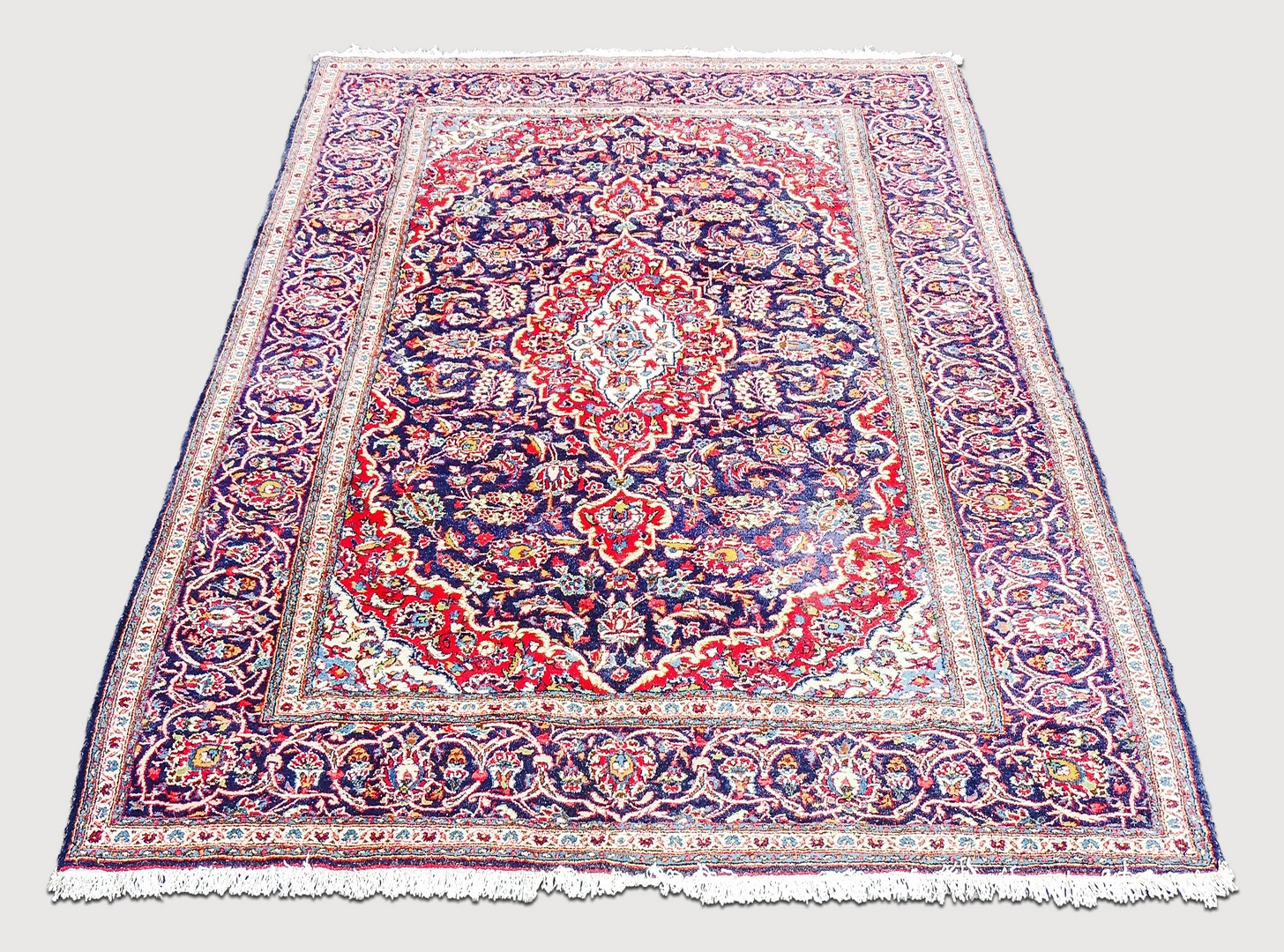 TAPPETO PERSIANO KEISHAN - PERSIAN KEISHAN CARPET fondo blu, campo a motivo floreale, medaglione centrale rosso, bordura blu, cm 295x195