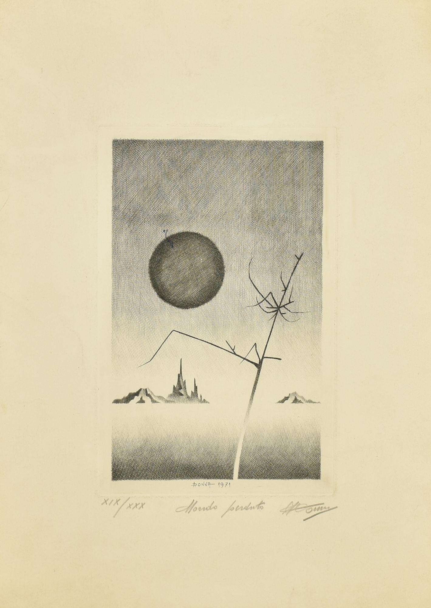 Armando Donna MONDO PERDUTO acquaforte su carta, battuta cm 29x18,5, su...